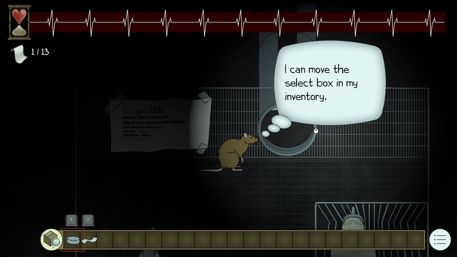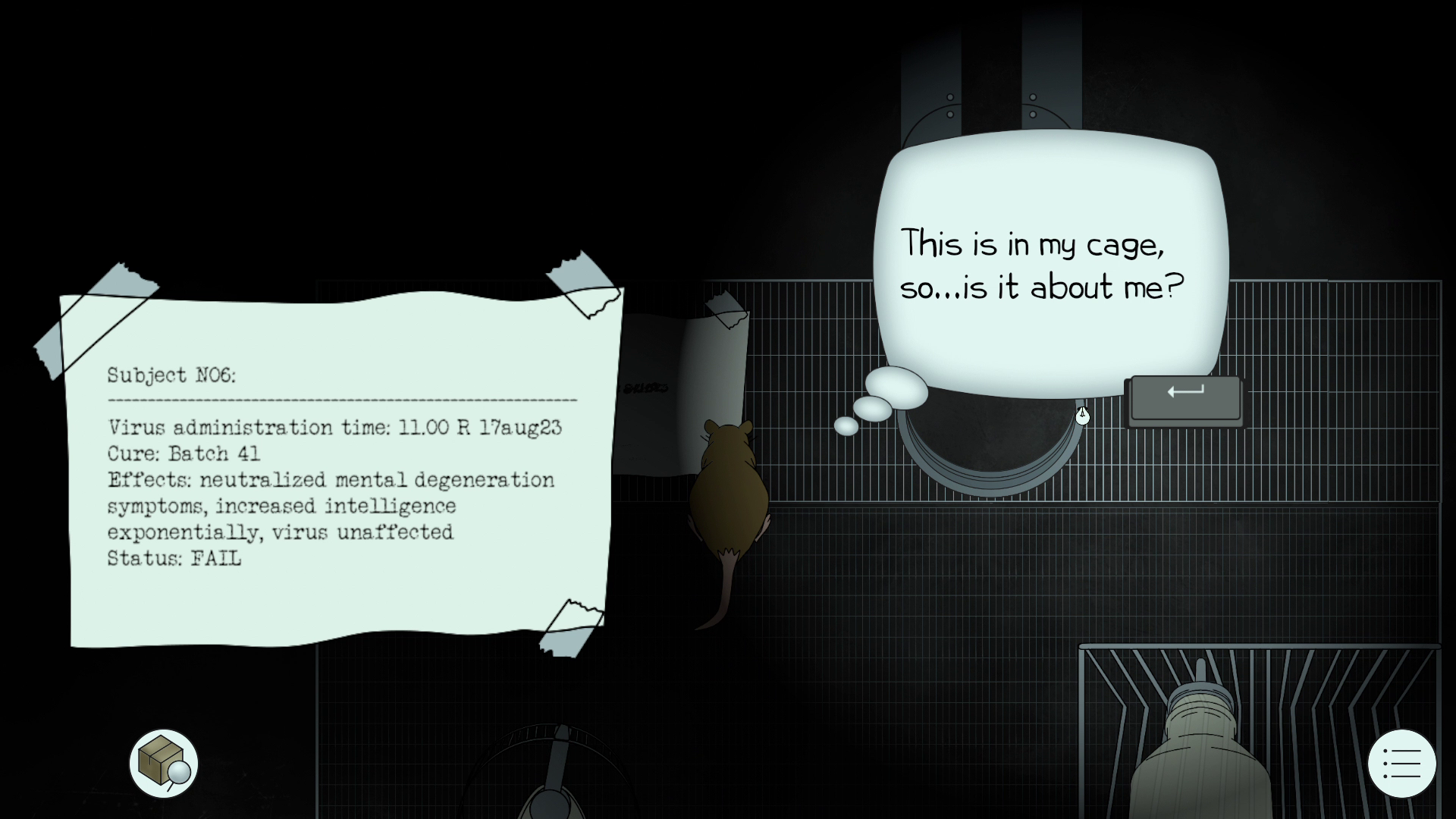 This lab rat -- Lab Rat N06 -- gains consciousness and finds himself in a dark and abandoned cage, learning that he has been given a deadly disease, so he must now figure out how to cure himself. Using his newfound intelligence, N06 must navigate a laboratory-built maze by solving puzzles, crafting tools, and avoiding hostile lab animals, whose failed cures have induced rabid behavior. He must find left-behind scientists’ notes giving information on the virus to learn how to make the cure and finally escape.